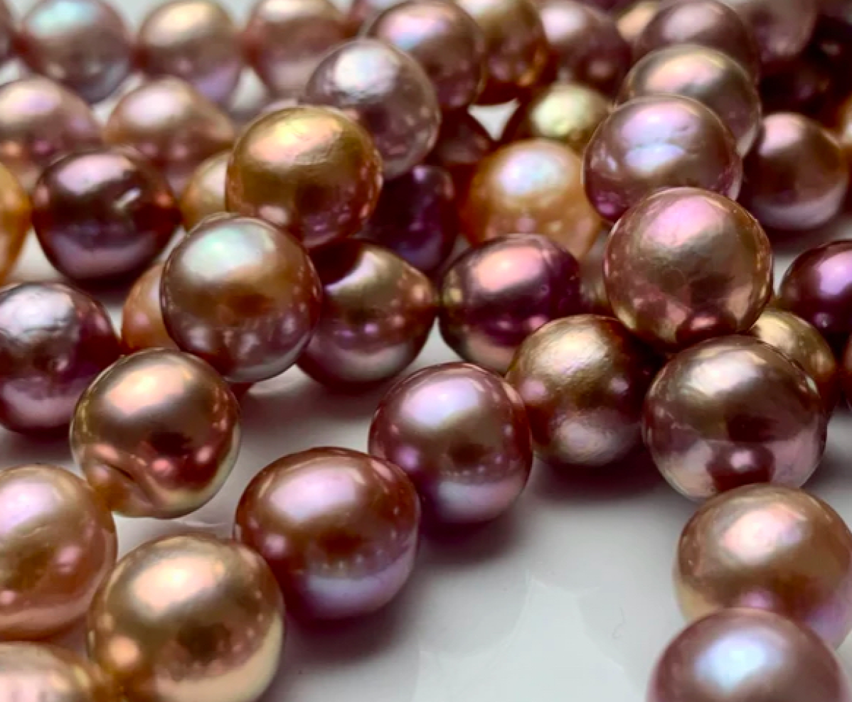 Kasumi pearls come in a variety of dazzling colours - cream, peach, many shades of pink, deep purple, and even golden green. Unfortunately, growing Kasumi pearls these days in Japan is threatened by the pollution of Lake Kasumi. Nowadays, freshwater Kasumi-style pearls are successfully grown in China. The Chinese equivalent of Japanese Kasumi is commonly referred to as "Kasumi like" or "Ripple Pearls".