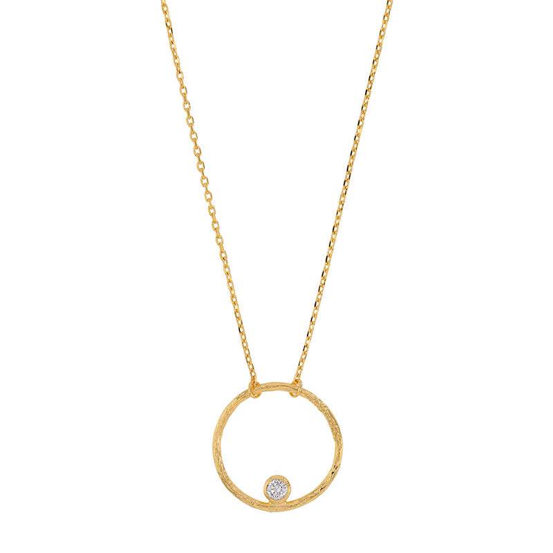 Gold-plated necklace with hammered finish circle pendant set with cubic zirconia